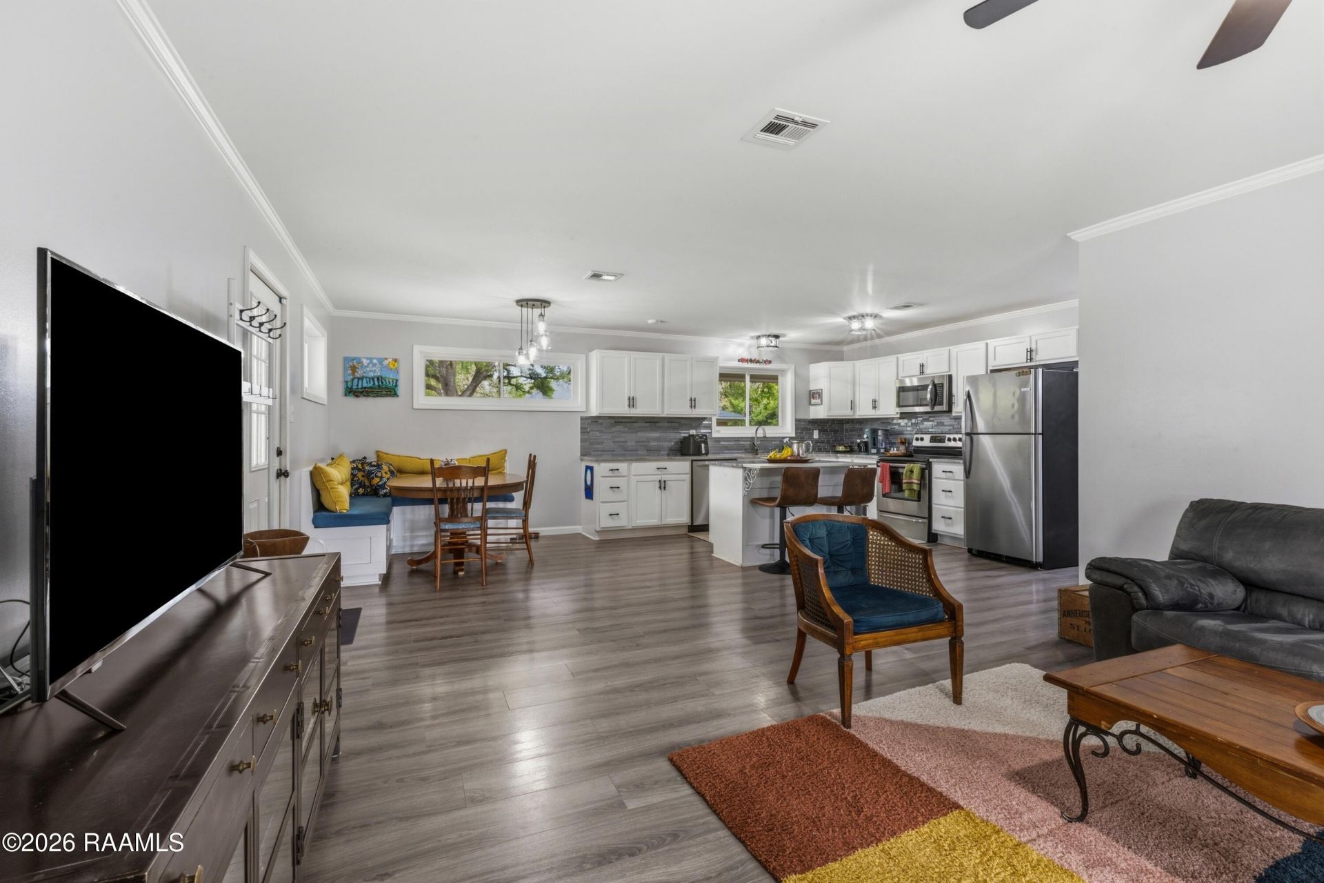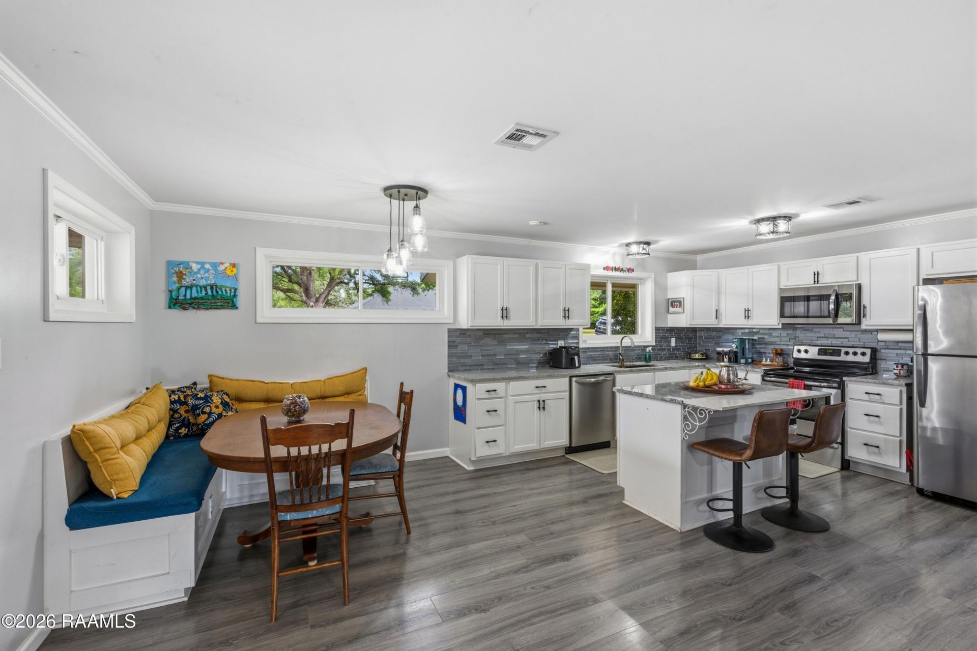 Welcome to 211 Mitze Dr., a charming and well-maintained home nestled in a peaceful Lafayette neighborhood. This 3-bedroom, 2-bathroom property offers a thoughtfully designed open-concept layout, seamlessly connecting the living area to the kitchen--perfect for both everyday living and entertaining. The kitchen features beautiful granite countertops, a convenient water filtration system, and flows effortlessly into a cozy dining space complete with a built-in corner bench for added character and functionality. Durable LVP flooring runs throughout the home, complementing the many upgrades, including energy efficient windows.Enjoy the practicality of a spacious laundry room and the added comfort of an ultraviolet light feature in the shower. Step outside to a large, shaded backyard set on nearly half an acre (.43 acres), complete with a covered back patio--perfect for relaxing or hosting guests. The property also includes a nice workshop/storage shed, offering excellent space for hobbies, tools, or extra storage. Mature fruit trees producing persimmons and pecans add even more charm to this outdoor retreat. With its quiet surroundings, modern touches, and generous indoor and outdoor